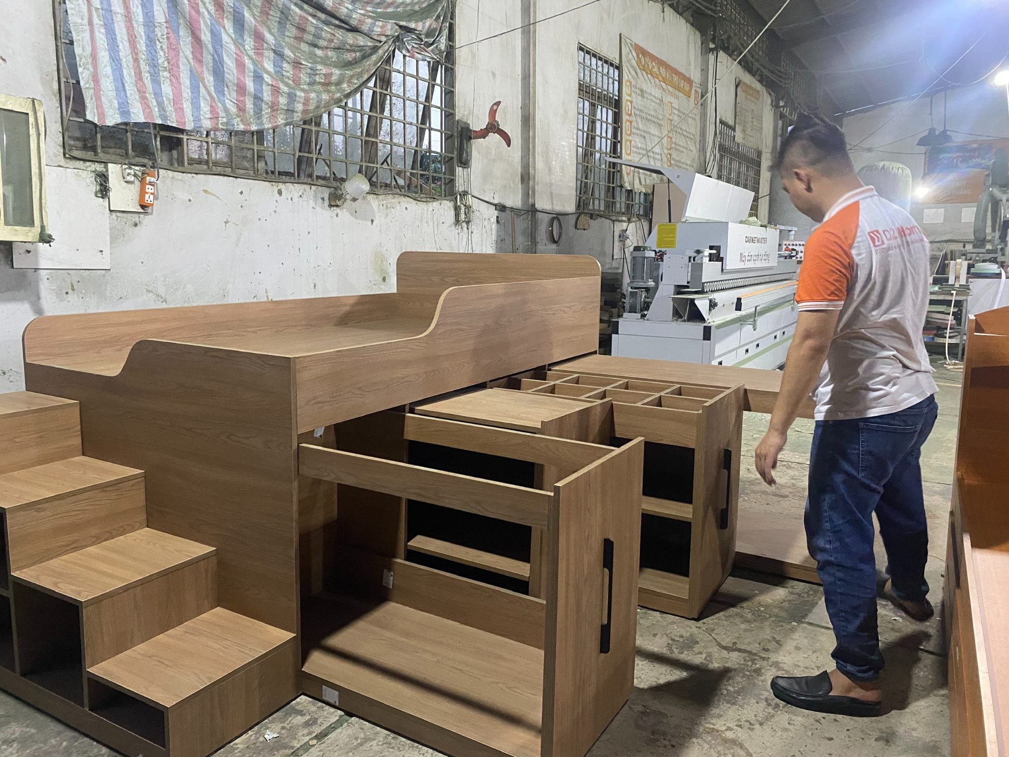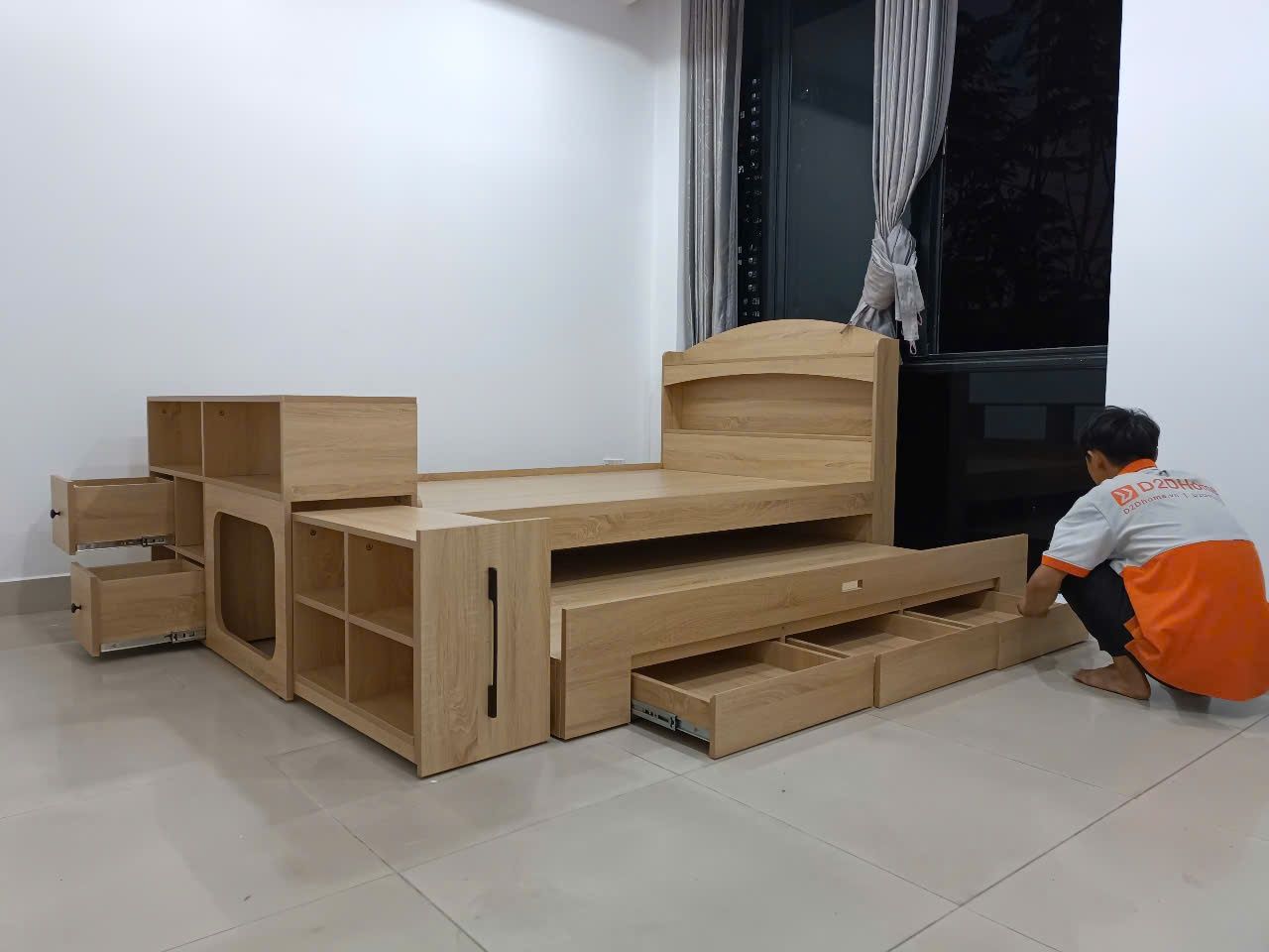 - Đa công năng: Kết hợp giường + tủ + bàn + kệ sách.