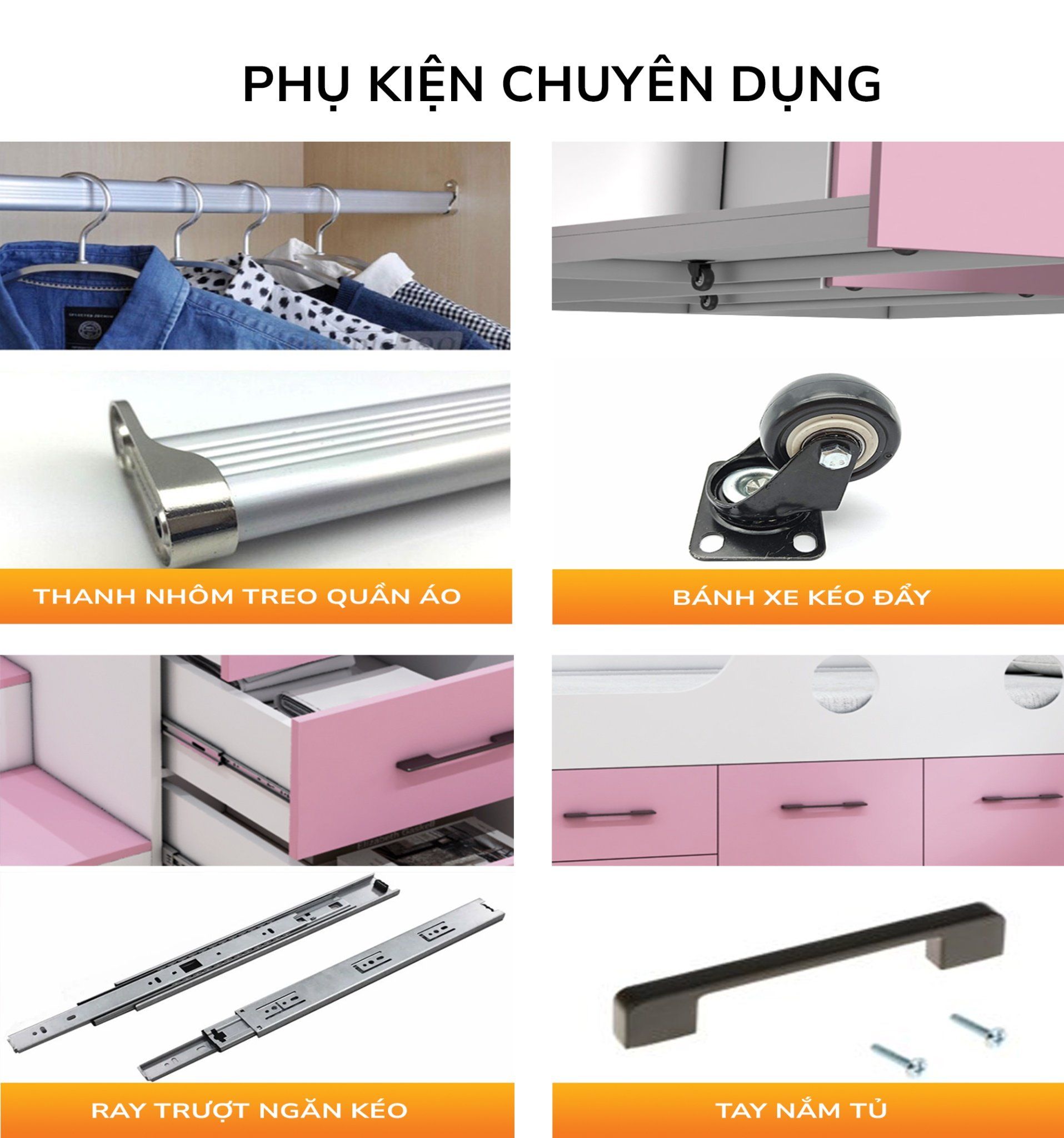 - Bao gồm bản lề, ray trượt, chốt khóa an toàn, tay nắm, giảm chấn...