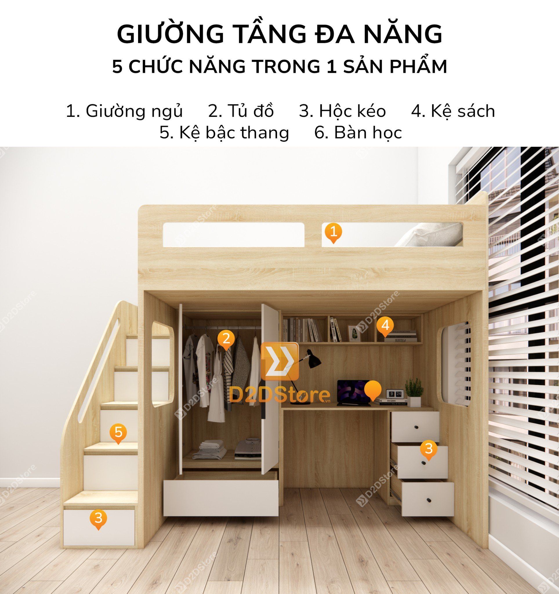 Thiết kế chắc chắn, có cầu thang, ngăn kéo, tủ và kệ sách tích hợp. Phù hợp cho gia đình có nhiều con nhỏ.