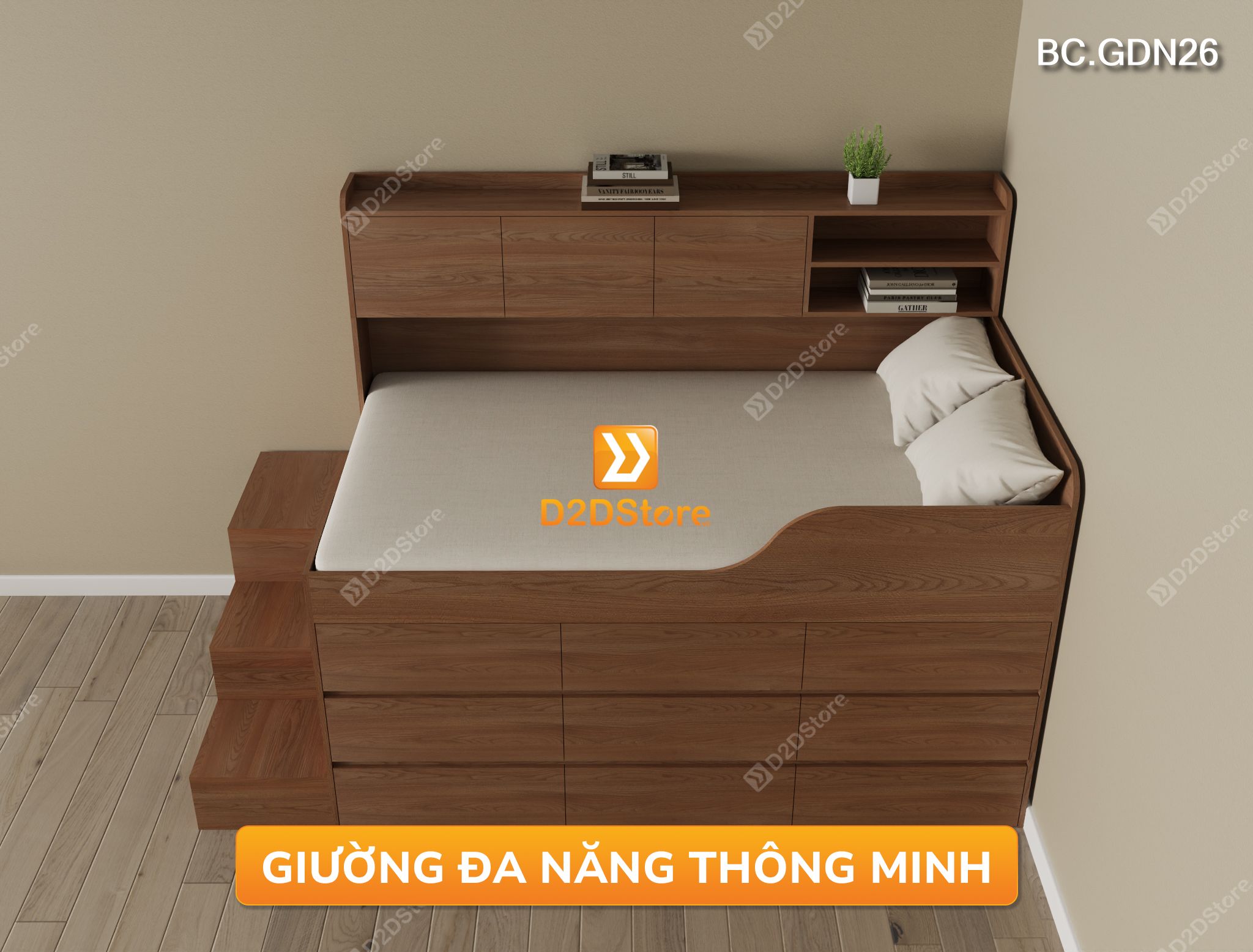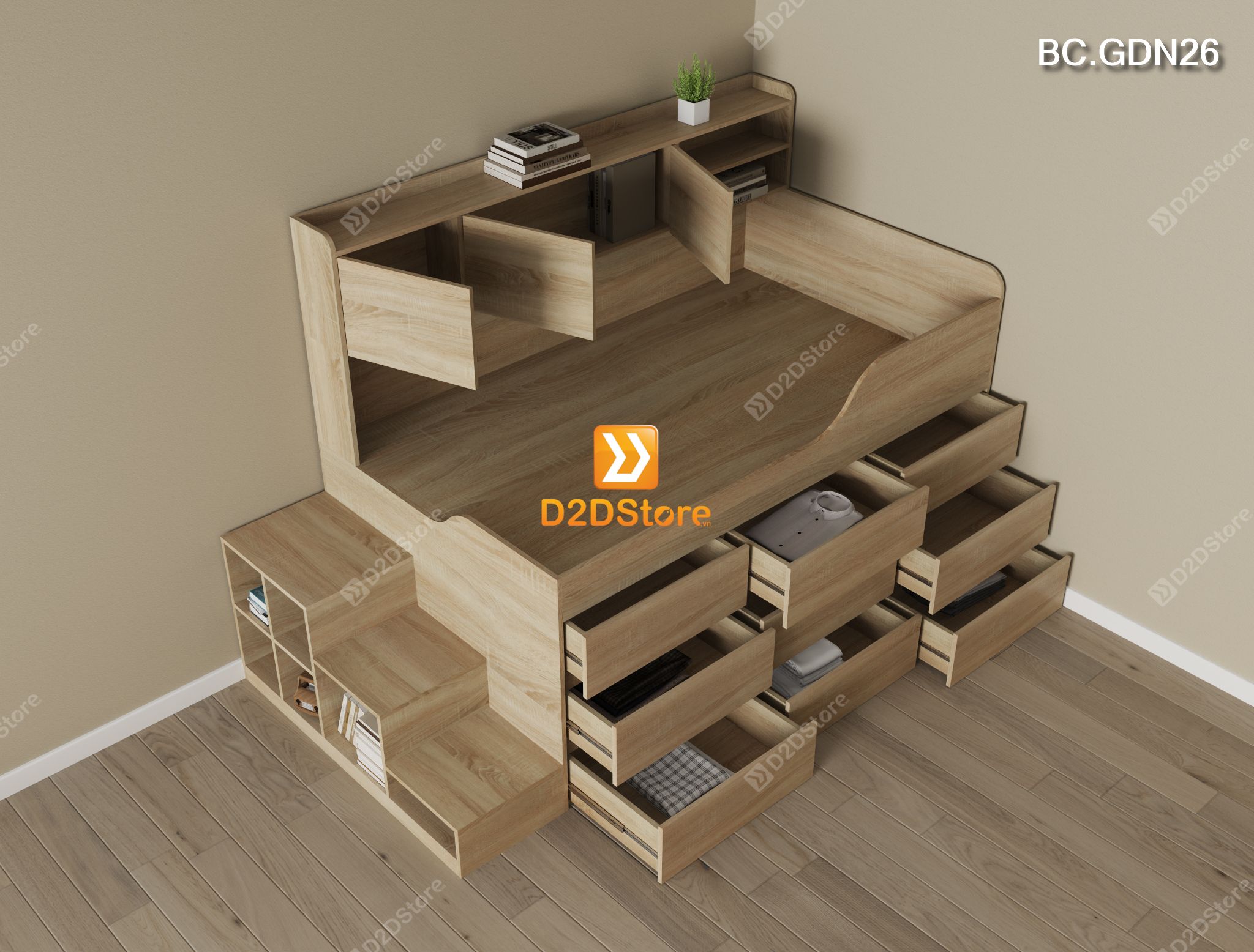 Đừng lo! Giường ngủ đa năng tại D2Dstore là giải pháp tuyệt vời cho bạn, không chỉ đáp ứng nhu cầu để ngủ mà còn tăng diện tích lưu trữ đồ đạc, mẫu giường ngủ đa năng này được thiết kế tích hợp đa công năng gồm giường ngủ, 09 ngăn kéo, tủ kệ, bậc cầu thang tích hợp hộc tủ lưu trữ, sẽ là sự lựa chọn hoàn hảo giúp tinh gọn không gian phòng ngủ cho bạn, vừa thẩm mỹ vừa tiện nghi và tiết kiệm diện tích, vô cùng phù hợp cho phòng ngủ có diện tích nhỏ.