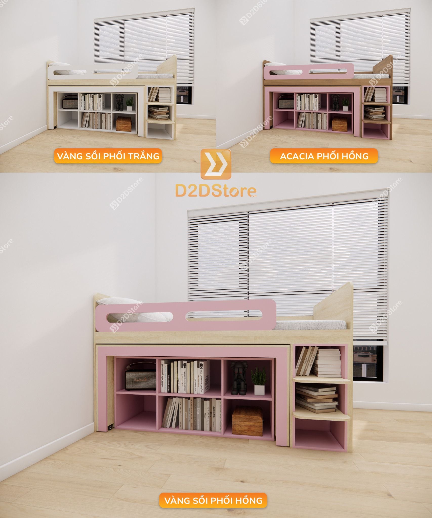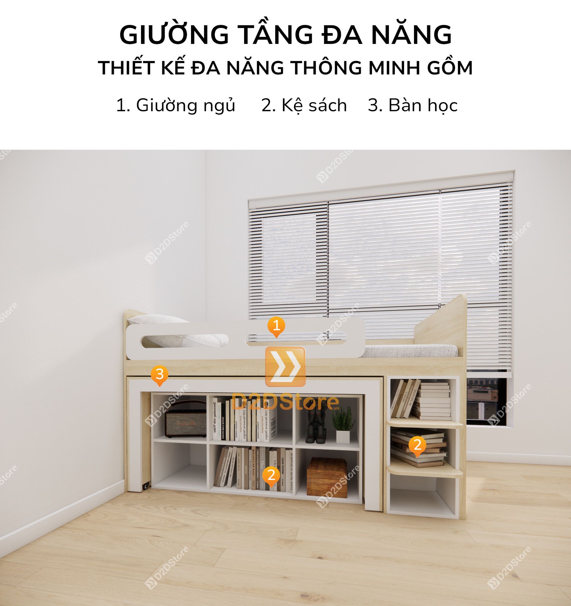 Đừng lo! Giường ngủ kết hợp bàn học tủ áo tại D2Dstore là giải pháp tuyệt vời cho bạn, không chỉ đáp ứng nhu cầu để ngủ mà còn tăng diện tích lưu trữ đồ đạc, mẫu giường ngủ đa năng này được thiết kế tích hợp đa công năng gồm giường ngủ, ngăn kéo, tủ treo quần áo, bàn học/bàn làm việc di động là lựa chọn hoàn hảo giúp tinh gọn không gian phòng ngủ cho bạn, vừa thẩm mỹ vừa tiện nghi.
