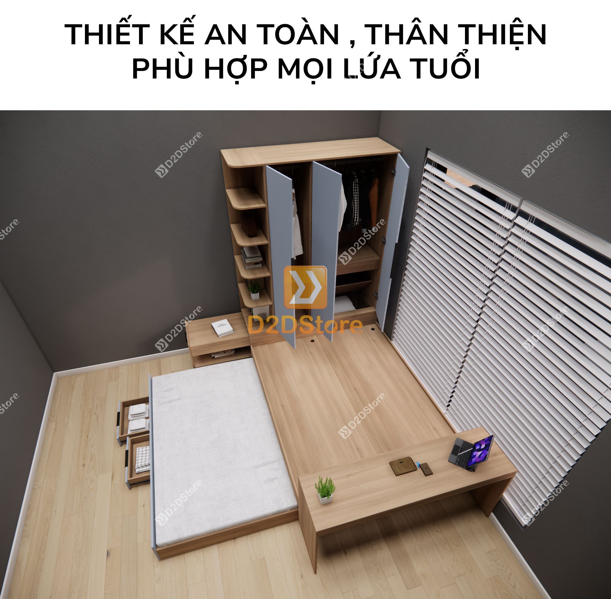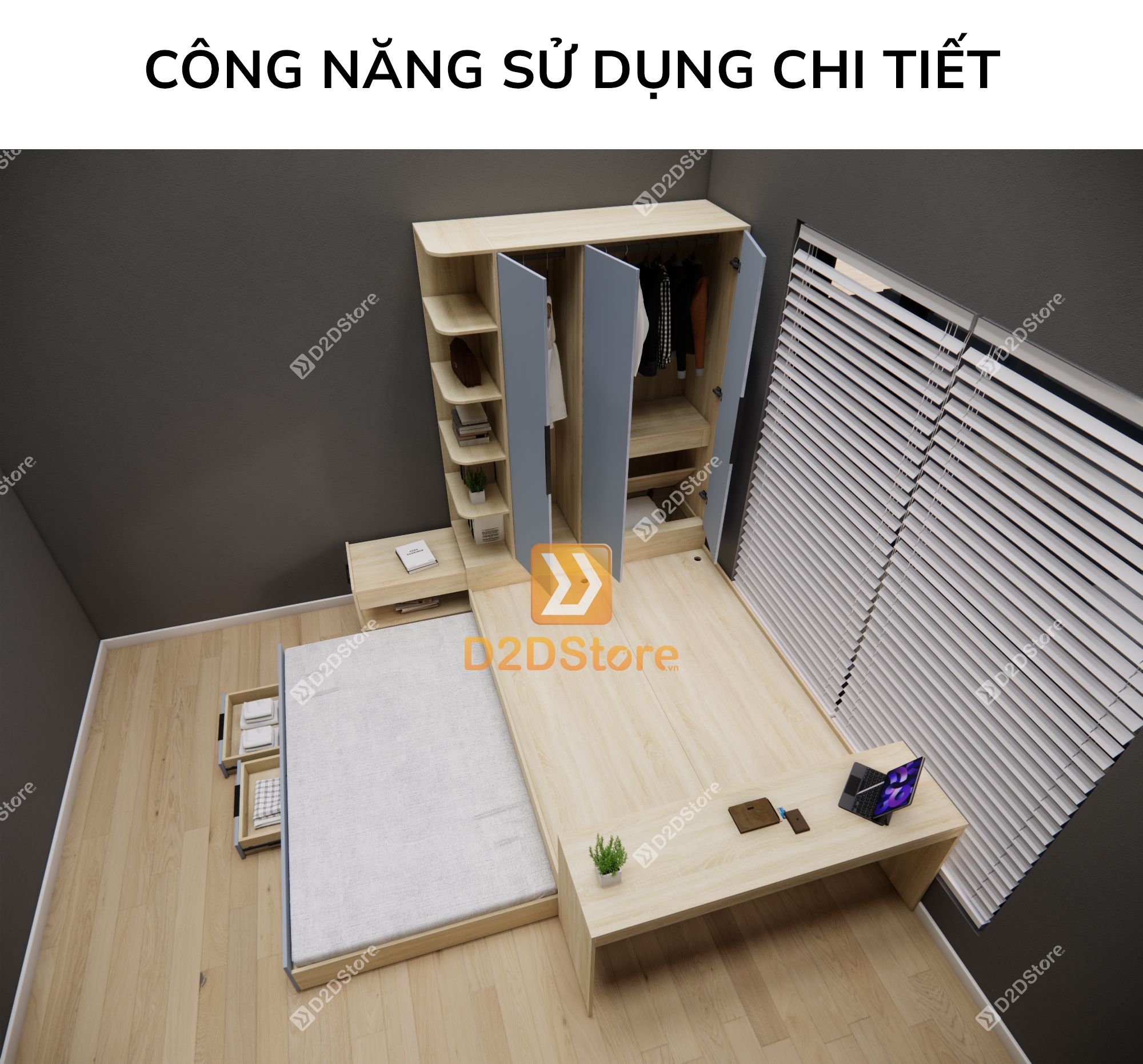 Đừng lo! Giường ngủ kết hợp tủ quần áo tại D2Dstore là giải pháp tuyệt vời cho bạn, không chỉ đáp ứng nhu cầu để ngủ mà còn tăng diện tích lưu trữ đồ đạc, mẫu giường ngủ đa năng này được thiết kế tích hợp đa công năng gồm giường ngủ, ngăn kéo, tủ treo quần áo là lựa chọn hoàn hảo giúp tinh gọn không gian phòng ngủ cho bạn, vừa thẩm mỹ vừa tiện nghi.