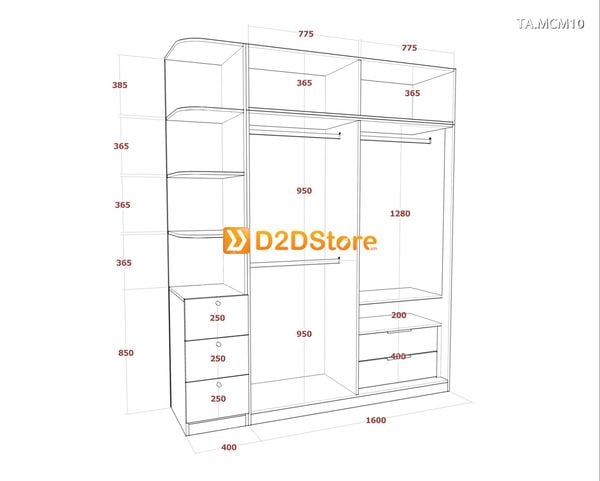 Kích thước chi tiết tủ quần áo bằng gỗ TA.MCM10 do đội ngũ D2DStore thiết kế